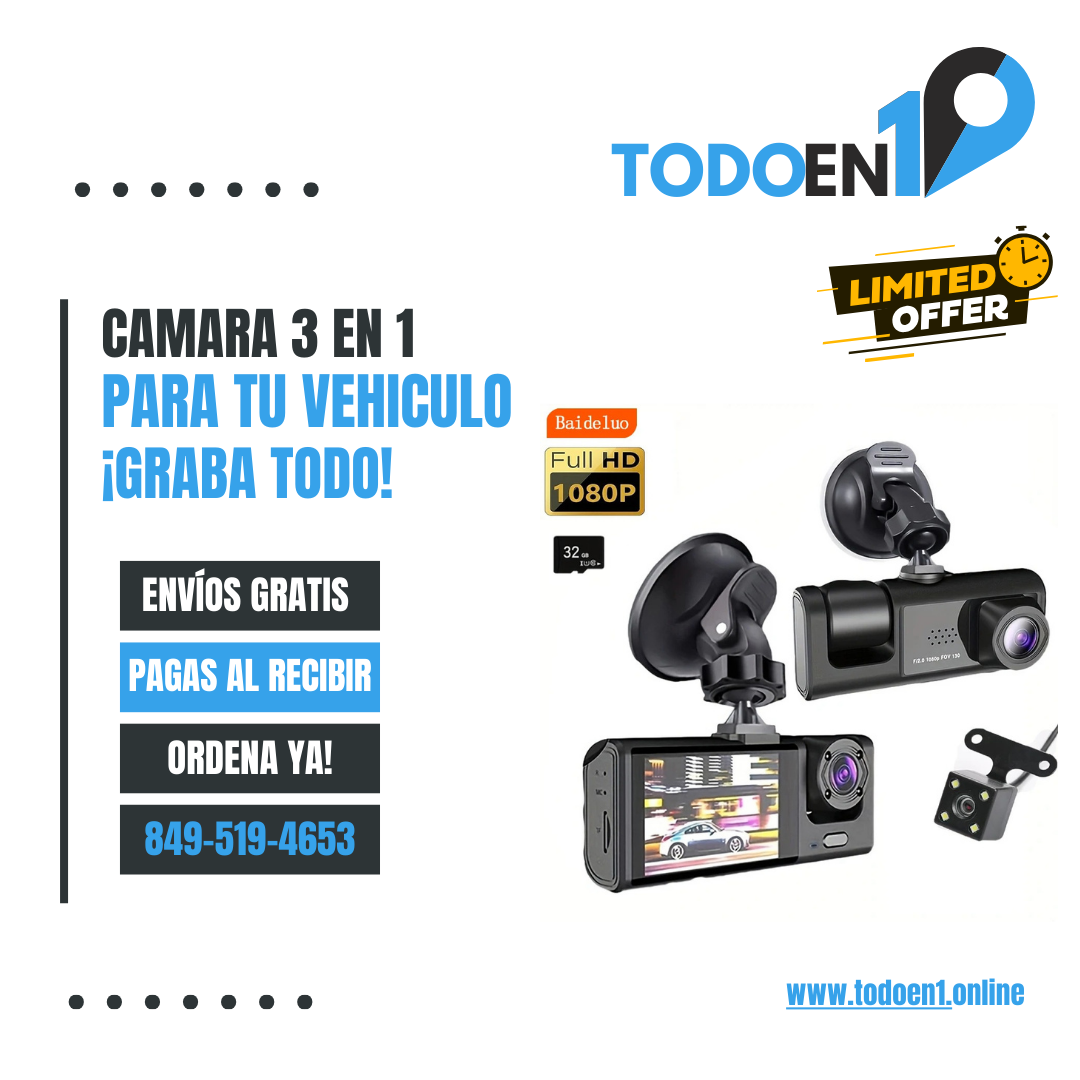 La Cámara Delantera, Trasera e Interna HD con Visión Nocturna es tu solución ideal. Esta innovadora dashcam graba en alta definición, ofrece visión nocturna, y te permite monitorear todo lo que ocurre dentro y fuera de tu vehículo.